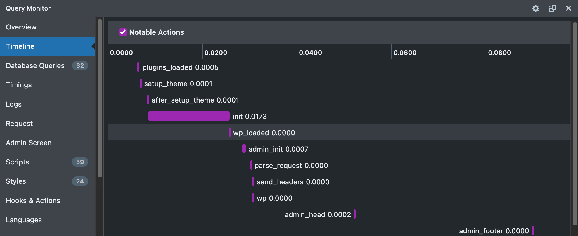 New timeline panel provides a useful visual overview of the events that occur during a page load. Database queries, HTTP API requests, PHP errors, timings, logs, etc.